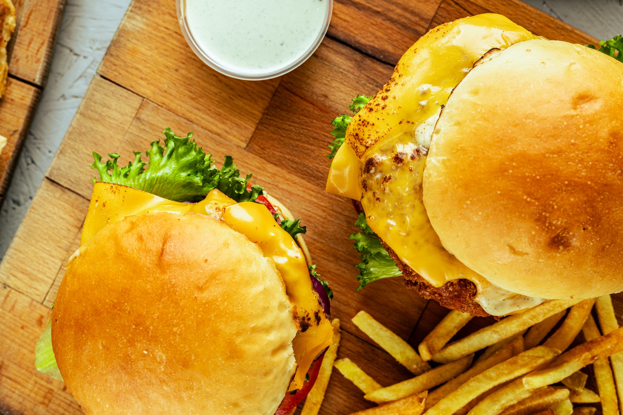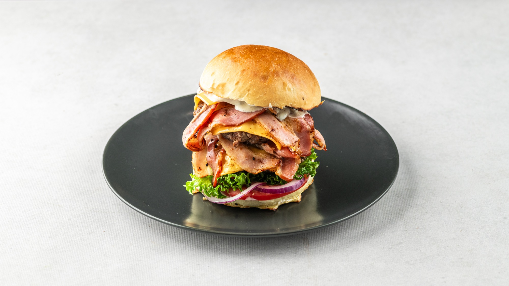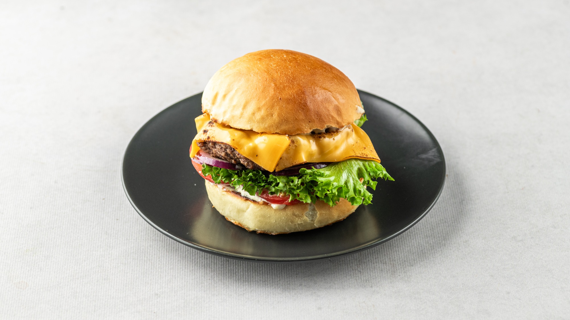 120 g farszu z dominant lula wołowo-wiepszowy ser cheddar, sałata, ziemniaki,prażona cebula pomidor, sos autorski.